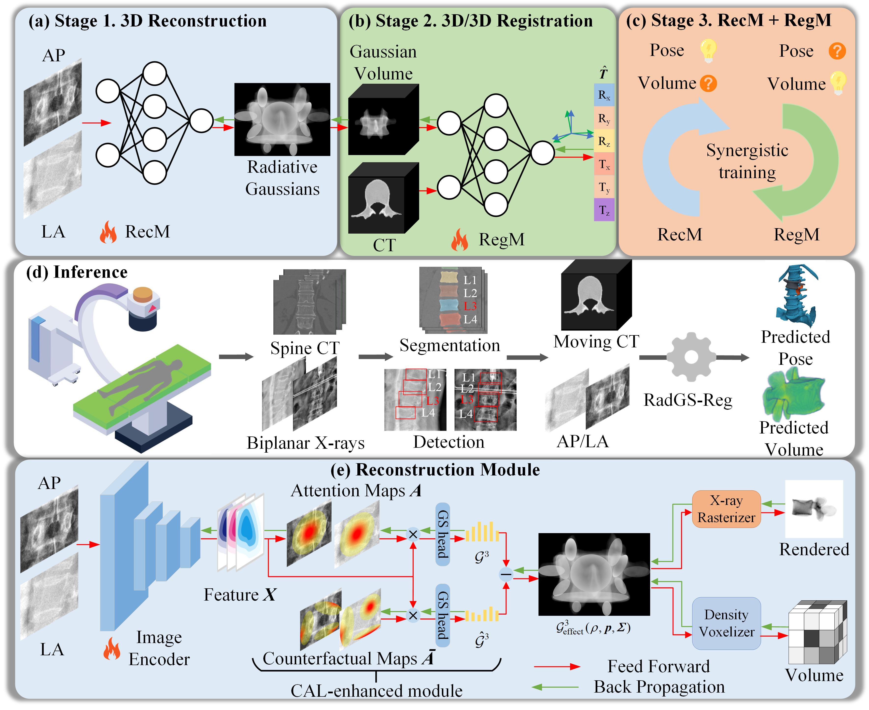 Inspired by recent progress in 3D reconstruction in the field of computer vision, we present a novel approach termed RadGS-Reg to joint learning of Radiative Gaussians Reconstruction and 3D/3D Registration for CT/Xray Registration. This methodology entails the transformation of biplanar X-rays inputs into Radiative Gaussians (RadGS), which is subsequently registered with the provided CT volume. The task of accurately reconstructing RadGS using only biplanar X-rays presents a significant challenge. To address this, we unveil the synergistic interaction between 3D reconstruction and CT/3D Gaussians registration. Specifically, the shape of the preoperative CT volume constitutes the ultimate target within the 3D reconstruction process. Concurrently, the pose of the RadGS derived from biplanar X-rays is registered with the target pose of the preoperative CT volume. To mitigate the issue of spinal pose variation in CT and X-ray, we utilize the visually-grounded, region-specific vertebral-level identified in X-rays, along with the vertebral-level in the CT volume segmented using existing methods for vertebrae segmentation. To address the complication posed by the overlap of adjacent vertebral joints, which may impede the reconstruction of individual vertebrae, we integrate Counterfactual Attention Learning (CAL), concentrating on vertebra regions to enhance reconstruction accuracy.